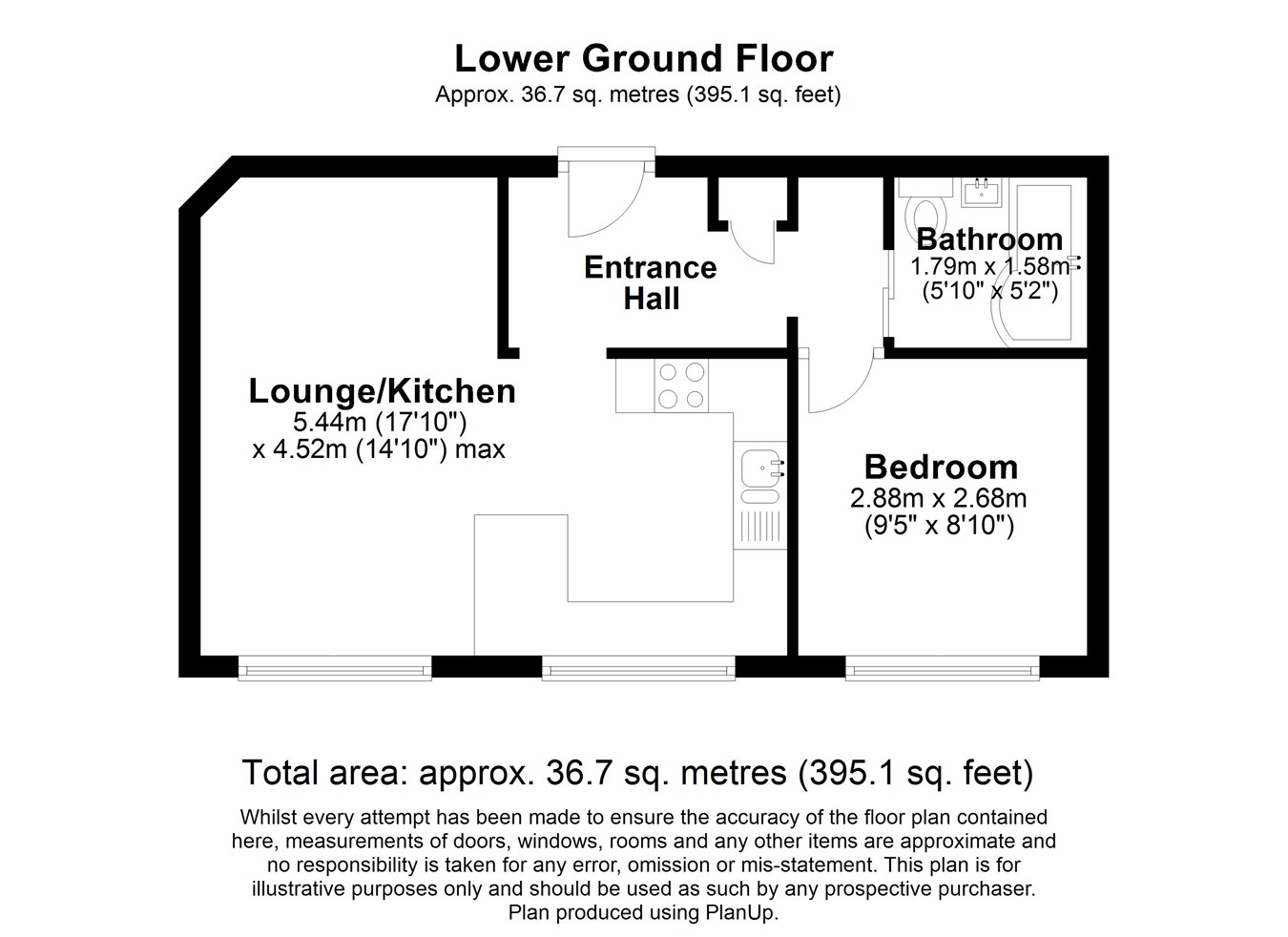 A welcoming hallway which leads onto an open plan living/kitchen area. The kitchen is fitted with white gloss units, black worktops with an integrated cooker, hob and extractor fan. Space for a washing machine and fridge/freezer. Vinyl flooring in the kitchen area. The lounge is painted neutrally with carpet. The bedroom is a good sized double bedroom again decorated neutrally with carpeted floors.