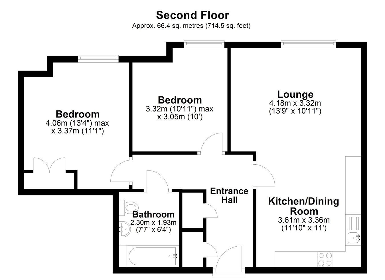 13' 4" x 11' 11" (4.06m x 3.63m)